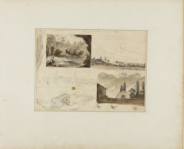 Here is "Vier voorstellingen," or "Four views," an etching by Johann Caspar Nepomuk Scheuren. These four miniature scenes are arranged on a single sheet, each a tiny window into different worlds of landscape and human activity. The artist used delicate lines and a monochromatic palette to create subtle variations in light and shadow. Scheuren masterfully uses composition to guide the viewer's eye in each of the four scenes. Each scene contains horizontal lines formed by water, land, or horizon. These linear structures create a sense of depth, as do the varying scales of objects and figures that become smaller in the distance. In the top left, boats glide across the water, while the top right shows figures clustered on a raft. The lower left shows a tranquil waterside scene with trees mirrored in the calm water. The lower right shifts to an elevated perspective, showing a landscape with distant hills. These images are like lines of text that convey information through pictorial codes. They reveal an interest in the landscape and human form and how these elements interact to convey meaning.