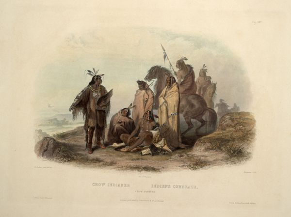Curator: This watercolor by Karl Bodmer, dating to 1844, is titled 'Funeral Scaffold of a Sioux Chief near Fort Pierre'. What are your initial thoughts? Editor: It evokes a stark kind of beauty, I think. A sense of open space, punctuated by the presence of these teepees and the scaffold itself. It makes you think of endings, but also a kind of enduring presence of life amidst grief. Curator: Indeed. Bodmer was meticulous in documenting the materials used in the Sioux culture; look at the detail in the hide work on the teepees, the careful rendering of clothing, even the tools. This precision challenges any romanticized notions, giving us a grounded sense of their existence. He was, in effect, documenting labor, lifeways, and cultural practices. Editor: I can see that. There's something in the scene's stillness, a quiet observation. You can almost hear the whispering of the wind and feel the dust underfoot. And the raising of the scaffold… that gesture of elevation, setting the body towards the sky. It's both practical and incredibly poignant. Did Bodmer actually witness this? Curator: Absolutely. He and Prince Maximilian spent considerable time among various tribes. His art became deeply entwined with what he witnessed firsthand. You see this reflected in his portrayal. These were not fabricated scenes, but moments meticulously recorded. Note also the way he positions the human figures, some are gesturing, some are seated, but all very realistically. It shows respect and highlights that he wasn’t just casually making something up for commercial gain. Editor: I hadn’t thought of the risk involved at the time. This journey to produce an art piece represents access but, also, intervention. He’s transforming a people and place, turning this sacred scaffold and community into an object of consumption for others back in Europe. He's shaping perception, whether intentionally or not. Curator: Precisely. These images then played a vital role in shaping the European perception of the American West and the indigenous populations, contributing to—or sometimes challenging—prevailing narratives. The very act of watercolor painting here—with the availability of these materials—reflects its own complex social-political narrative about who has access to produce work like this and how its viewing will later come to define the people documented within. Editor: What a thing. Even the act of observing shapes what's observed and, even now, we continue observing it. Thanks, that made me see so much more. Curator: You're welcome. The past is ever present in art, always something new to uncover.