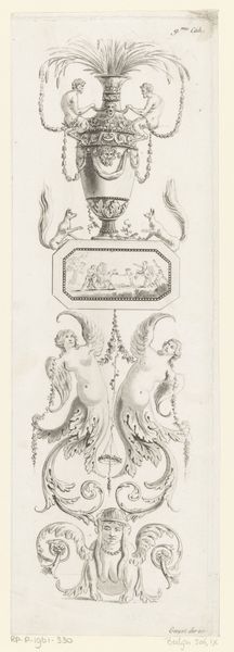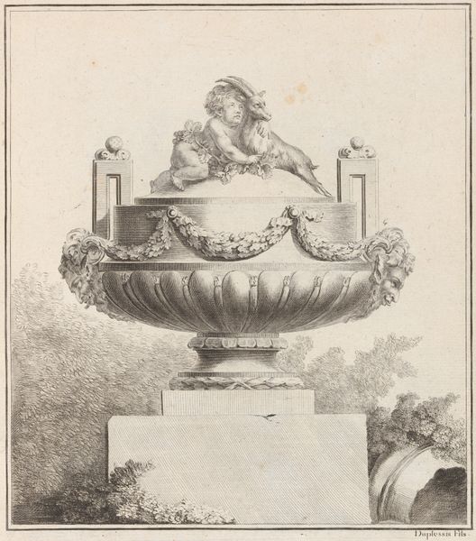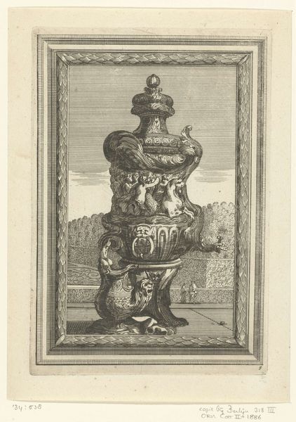 Curator: Editor: This engraving from 1667, "Olielamp en voetstuk of bassin" by Françoise Bouzonnet, depicts an ornate oil lamp and pedestal. The detail is remarkable, but it also feels very… removed, almost like an instruction manual. What do you see in it? Curator: I see an articulation of baroque values through its meticulous rendering of form, yes, but also an insight into the culture of consumption surrounding luxury goods in the 17th century. Engravings like these weren’t just aesthetic objects; they were blueprints for skilled artisans. Editor: Blueprints? So, like Ikea instructions for elaborate metalwork? Curator: Precisely! These weren't mass-produced objects, yet the image facilitated a type of distributed production. The engraving becomes a crucial component of the object's creation, documenting the intricate labor involved. What is the relationship between craft and artistic production in the Baroque period? The drawing blurs boundaries between design and reproduction, suggesting an intertwined economic and cultural reality. Notice how every line, every curve is meticulously rendered. Editor: So, it’s about showing the elite exactly *how* to show off their wealth? Curator: Exactly. And more than that, the print also *becomes* a part of that system. Each line signifies labour and cost and can therefore itself be seen as currency. Consider also the global trade networks that supplied the materials and labor required to execute such designs; from where do these materials originate, who crafts them? Editor: That’s fascinating! It makes me consider all the unseen labor that goes into the things we take for granted, even now. Curator: Precisely! Thinking about art through the lens of its material creation can open up new pathways to understand past economies and cultural exchanges. We tend to place artworks high up as achievements of pure talent. Considering the conditions of artistic labor and access to materials challenges these traditional viewpoints, making us consider *what* are, truly, the means of production.