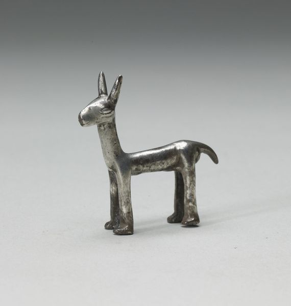 This small sculpture, titled "Dog," was created in Ordos. The bronze material immediately draws the eye, its greenish-brown patina a testament to age and exposure. The artist has captured the essence of the animal through simplified forms, emphasizing the curve of its back and the lean lines of its legs. The dog's form is remarkably streamlined, each part flowing into the next, creating a sense of continuous movement and poised alertness. The smooth, polished surfaces contrast with the rougher, corroded areas, adding a tactile dimension to the visual experience. Consider how the artist plays with volume and void, the solid mass of the body balanced by the open spaces beneath, lending the sculpture an airy, almost weightless quality. This interplay is critical, as it challenges our perception of solidity and presence. The sculpture functions as a semiotic marker, signifying not just a dog but also ideas of loyalty, guardianship, and perhaps, a connection to the spiritual realm. This dynamic interaction of form and meaning invites us to engage with the sculpture on multiple levels.