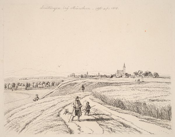 Editor: We’re looking at Gerbrand van den Eeckhout's "View of Rhenen and the Rhine from the East," created in 1663 using watercolor and drawing techniques. It’s striking how the artist captures this vast landscape with such delicate lines and muted colors. What do you see in this piece that I might be missing? Curator: The interplay of line and wash immediately draws my attention. Notice how the artist utilizes thin, almost transparent washes of watercolor to delineate the distance, contrasting with the more defined pencil work in the foreground fields. It’s a study in perspective achieved through both tonal variation and textural contrast. Editor: I see what you mean about the texture. Does the tower’s verticality play a role in the composition? Curator: Undoubtedly. The tower serves as a central vertical element, disrupting the horizontal flow of the landscape. This not only draws the eye upward, establishing a sense of depth, but also anchors the cityscape within the broader composition. The fence-like lines in the fields lead our gaze towards that central object as well. Editor: So, it’s not just a representation of Rhenen, but a carefully constructed arrangement of visual elements? Curator: Precisely. Consider how the meandering river and the subtly modulated sky further contribute to the overall structural balance. The light, almost ethereal quality of the washes creates a sense of atmosphere, a crucial element that softens the potentially rigid geometry of the landscape. Notice, however, how each stroke retains its identity, avoiding total blending; the material properties thus enhance the form. Editor: That's fascinating. I never thought about it that way. I always saw it as a nice picture of a city, but now it is clearly more complex. Curator: Yes, precisely, the composition is anything but accidental! Every compositional aspect directs the observer’s experience and interpretation of the space.