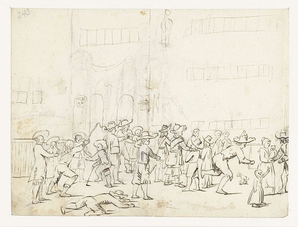 Curator: Pieter Holsteyn II, a Netherlandish artist, created this lively drawing titled "Dancing Farmers". It is now held here at the Städel Museum. Editor: It's fascinating; a real sense of movement. The way the figures are drawn, they almost burst off the page, don't they? I am also struck by its earthiness. It feels like an honest depiction of revelry. Curator: Holsteyn's drawing provides valuable insights into the visual culture of his time. This scene speaks to the public role of art as something accessible to all social classes and as a recorder of folk culture. Editor: Absolutely, and let's not overlook the materials used; ink and coloured pencils on paper. This deliberate choice brings us closer to an understanding of how these ordinary festivities were both envisioned and created through these humble materials. Look closely; there's such texture achieved through the layering. Curator: Genre painting like this was quite popular and gave a voice to marginalized populations. Holsteyn’s “Dancing Farmers” reflects on societal trends during the Baroque period, as an important genre painting reflecting rural life. Editor: I agree, but I see more than just documentation. This is physical, tactile stuff; look how they hold hands, jump in circles and chase one another. Holsteyn wasn't interested in prettying them up, it seems. No, this drawing captures an act of material labor: uninhibited celebration, a brief respite from the toil of labor in the fields, etched onto paper with clear intention and using rudimentary implements. Curator: Indeed! Consider, also, that this artwork made its way into a museum—the Städel. That transition tells a story itself of how cultural institutions shape our understanding of what art is. Editor: Well said. For me, though, I am reminded how the simplest means, pencils and paper, can give rise to work that's deeply affecting, deeply humane even after all these years. Curator: A splendid view indeed. It shows us just how deeply historical context influences the perception of art. Editor: Right, it all boils down to the experience that these drawings and historical analyses trigger!