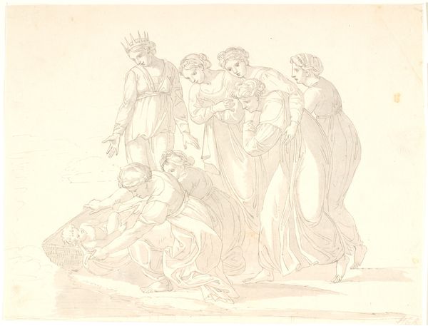 This print of “Moses Saved by the Pharaoh’s Daughter” was made by Anne Claude Philippe Caylus using etching, a process that is both technical and indirect. The image begins with a metal plate, likely copper. Acid is used to bite into the metal, creating recessed lines that will hold ink. This is a very different kind of mark-making than drawing directly with a pencil or pen. It requires a high degree of control, and an ability to plan the image in advance. In this print, the acid is used to create a delicate network of lines, giving the image a sense of depth and atmosphere, evoking the biblical scene with a sense of drama. The entire process involves skilled labor, from the preparation of the plate to the final printing. In a sense, the print is both a work of art and a product of collective effort, reflecting the social and economic conditions of its time. This reminds us that even seemingly straightforward images have complex stories embedded in their making.