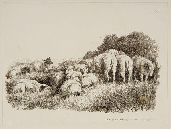 Editor: This is Samuel Howitt’s “Sheep Resting on a Hill.” I’m struck by the textures created through the etching, especially in the wool and the rough ground. What can we say about its creation? Curator: Consider the materiality of the print. Howitt's choice of etching, a process enabling reproducible images, speaks to the increasing commodification of art in the late 18th century. These weren't unique paintings; they were goods. Editor: So, the means of production really change how we view it? Curator: Precisely. These images catered to a growing market interested in picturesque scenes, reflecting a shift in land use and agricultural practices as commodities. Editor: It’s interesting to consider that this serene image has a connection to economics. Curator: It’s a reminder that art is always tied to its means of production and consumption.