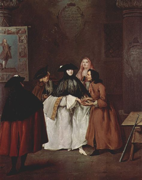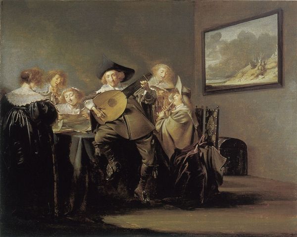 Editor: This painting, called *Merry Company*, is by Pieter Codde and was created during the Dutch Golden Age. It appears to be rendered in oil paint, depicting a group portrait with musicians and revelers. I’m struck by how it captures this fleeting moment of social interaction. What do you see in this piece? Curator: I'm drawn to the latent narratives hidden within. Look closely – the tilted lute implies a recent song. The glances exchanged between the figures suggest relationships beyond mere acquaintance. It reminds me that these “merry company” scenes often carried coded meanings. Is it truly carefree enjoyment, or a commentary on social mores, perhaps warning against idleness and vanity? What do their clothes tell us? Editor: Well, they are very elegant clothes, aren't they? What kind of symbols and meanings would wealthy patrons see in such artwork? Curator: Clothing, objects like musical instruments, and gestures operated as a language the contemporaries understood. Sumptuous fabrics signalled wealth and status. Music-making could symbolize harmony, but also transience. Each figure's pose, each interaction, speaks volumes. These weren’t just portraits but symbolic statements of identity and place within a complex social tapestry. Notice the shadow that seems to isolate the man seated on the chair from the rest of the merry company. Do you think that he is perhaps lonely, while the rest are together? Editor: That's a really insightful point. I hadn't considered that the shadow could symbolize isolation. It is like the artist is hinting to us about things unsaid. Curator: Exactly. That’s the enduring power of imagery, isn’t it? Visuals encode more than words often can. It allows artists to reflect social truths of a community, capturing its psychological, emotional, and cultural memory in accessible, lasting forms. Editor: That’s helped me look at the painting with entirely fresh eyes. Now I see how images are more than what meets the eye. Curator: Indeed, it prompts us to think critically about the values and social fabric of that time and what echoes it carries into ours.