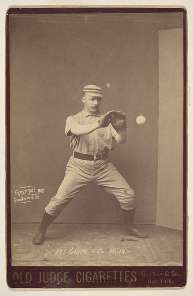 Editor: Here we have "John J. 'Jack' Clements, Catcher, Philadelphia, from the Old Judge series (N172) for Old Judge Cigarettes," a photographic print dating back to 1887, made by Goodwin & Company. It’s incredible to see this early image of a baseball player! The monochromatic palette certainly lends a nostalgic quality to the piece. How would you interpret this work? Curator: The focus here lies within the carefully constructed arrangement of forms. Observe how the figure's pose generates a dynamic interplay of diagonals, particularly through the extension of his limbs, contrasting with the implied verticality of his torso. The visual weight is masterfully balanced across the picture plane. Do you notice how the tonality reinforces the form? Editor: I do, now that you mention it! It is so interesting how the photographer captures the subject with this technique to bring out details in the photograph. Curator: Precisely! And we should not ignore the textural nuances—the smooth gradation of tones juxtaposed with the almost granular texture of the background. This creates a visual rhythm that enlivens what could otherwise be a static composition. The print's inherent qualities communicate effectively, irrespective of its subject matter. Editor: So, the impact derives less from what the image depicts and more from how the components work together visually? I see how breaking it down to its basic formal qualities can give us so much insight! Curator: Indeed. A deeper understanding emerges through analyzing the formal relationships—texture, tonality, line—irrespective of external references. This work presents a fascinating case study.