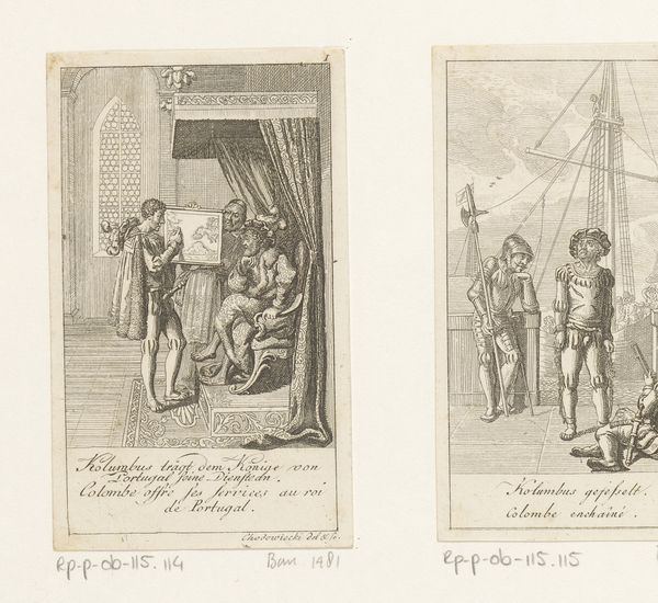 "George herkent zijn vader," or "George Recognizes His Father," is an etching by Daniel Nikolaus Chodowiecki. Produced during a period of significant social and political transformation, this print encapsulates the shifting dynamics of family and identity. During the Enlightenment, society's emphasis on reason and individualism caused a re-evaluation of traditional family structures. This work participates in that shift. It suggests a move away from the patriarchal structures that defined earlier eras, towards a more emotionally connected family unit. The print subtly challenges traditional representations by highlighting personal recognition and emotional bonds. The figures are not posed formally, but instead captured in a moment of genuine interaction. Chodowiecki’s work provides a glimpse into the evolving ideals of domestic life, reflecting the era's changing values. The artist invites us to consider the quiet revolutions occurring within the private sphere.