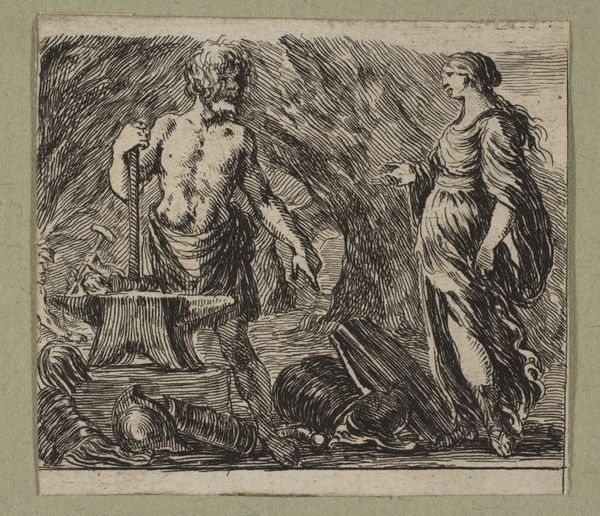 Stefano della Bella made this print, titled "Pan and Syrinx," sometime in the mid-17th century using the etching process. This technique involves covering a metal plate with a waxy ground, then drawing through it with a needle to expose the metal. The plate is then immersed in acid, which bites into the exposed lines, creating an image that can be inked and printed. The character of the etched line—fluid, spontaneous, and capable of great detail—lends itself well to this mythological scene. Note the density of lines used to create shadows and textures, like the reeds that morph into the fleeing nymph, Syrinx. Etching allowed for the relatively quick reproduction of images, making art more accessible. Consider the labor involved, from the preparation of the plate to the final print. This piece is a testament to how the materials and processes used in artmaking are intrinsically linked to its social and cultural context. By appreciating these aspects, we gain a richer understanding of the work.