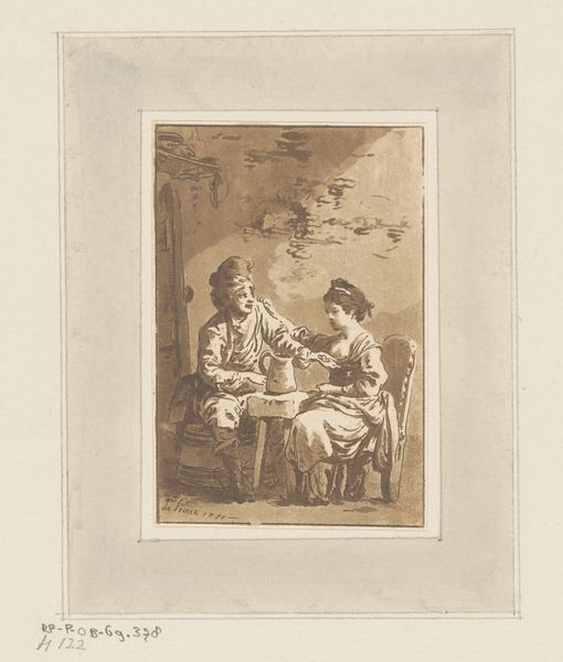 Editor: This is "Een van zin," which I believe translates to "Of One Mind," a lithograph print from 1847 by Johannes Christiaan d'Arnaud Gerkens. I'm really struck by the composition. There's a real sense of depth despite it being a print, but it has such limited tonal range. What do you see in this piece from a formalist point of view? Curator: Certainly. The figures are meticulously arranged to create a spatial paradox. We see an implied triangle linking the gazes and head positions. Consider how the light source is diffuse, almost dreamlike, obscuring detail, yet emphasizing the contrast in texture, between the man’s smooth, dark jacket and the rougher texture of the women's dresses. The foreground feels compressed due to the elevated POV, focusing attention on the relationships among the individuals, without grounding them to a specific space. Notice, also, how the artist used lithography to create what initially looks like smooth tonal changes and modeling in the faces, yet it's built up of marks. The subtle imperfections and graininess speak to both realism and an artistic intention. Editor: I hadn't thought about the significance of those imperfections. Curator: To elaborate, it seems d’ Arnaud Gerkens is engaging in a sophisticated play between line and mass, flatness and depth. It asks questions about how the lithograph print could embody both. Consider the background, for instance; how has d'Arnaud Gerkens used light and shadow to create the sensation of depth using minimal markings, but has used it so economically? It's the negative spaces that help delineate forms and provide dimension to an otherwise graphic composition. Editor: So, it’s the interplay of light and shadow, and the textures that give this lithograph its striking quality. The attention to details that, as a formal strategy, creates a world of emotion and complexity. Thank you for helping me to decode d'Arnaud Gerkens use of form. Curator: Precisely, and what you think that signifies formally will inform everything you take away from this work.