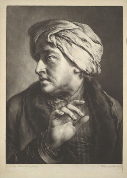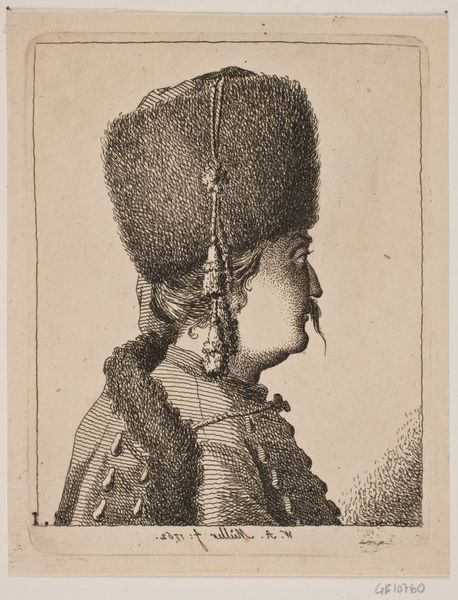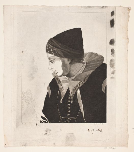 This is a print called "En Amagerpige" by Gerhard Ludvig Lahde, made sometime between the late 18th to early 19th century. The composition centers on a young woman in traditional garb, rendered with meticulous detail in monochromatic tones. Note how Lahde uses line and shading to define form, creating a sense of depth and texture. The woman's downcast gaze directs our attention to the sprig of greenery she holds, a symbol, perhaps, of nature or the simple life. The print invites us to consider the semiotics of clothing and identity. The intricate patterns on her headwear and vest suggest a cultural code, while her posture evokes introspection and grace. Lahde's work participates in the broader Enlightenment project of documenting and categorizing the world, yet it also hints at the complexities of representing cultural difference. Ultimately, the print functions as a site of cultural and aesthetic interpretation. Its power lies in its capacity to generate new meanings and perspectives.