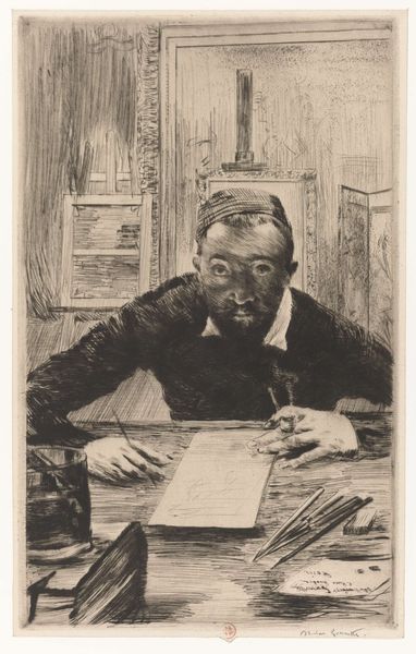 Theo van Rysselberghe captured Émile Verhaeren in oil on canvas, showing him in the act of writing. The marks are immediate, a mosaic of short strokes in a high-key palette. You can tell that he’s not trying to conceal the process; he’s embracing it. Look closely at the bookshelf behind Verhaeren. It’s a flurry of greens and blues, not quite representational but full of energy. The paint is applied thickly, you can almost feel the texture of the bristles. The artist’s hand is so present here. There’s a real sense of immediacy, like he’s trying to capture a fleeting moment. It's the gesture towards something concrete. This way of building up the image through small strokes reminds me of Signac, another artist who was fascinated by light and color. But Rysselberghe brings his own sensibility, capturing not just a likeness, but the very essence of Verhaeren's creative spirit. It's a painting that invites contemplation, leaving space for our own interpretations.