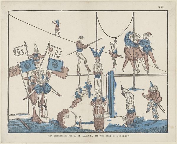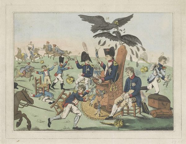 This political print by Christoph-Wilhelm Bock, made in 1815, uses etching to create a scene filled with caricatures and symbolic figures. The composition is structured with clear divisions; the left teeming with figures in supposed support of Napoleon, the right, a crowd of people celebrating his downfall. The allegorical figure of "Vergeld" (Retribution), with a hat, dress and banner, is placed centrally on a pedestal. The etching is designed to be read through its many visual cues and texts, which form a complex semiotic web. The artist seems to destabilize any established meanings, by layering figures with text and symbols. Bock challenges fixed meanings by satirizing historical events and figures, turning a political statement into a complex, visually engaging commentary. The linear quality of the etching technique enhances the clarity of the message, ensuring that each character and symbol contributes to the overall narrative of Napoleon's defeat.