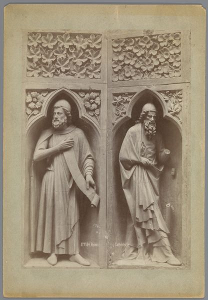 Editor: This gelatin silver print captures plaster casts of sculptures from the Reims Cathedral, dating back to sometime between 1875 and 1900. The light gives them an ethereal feel. What strikes me most is how a photo captures sculpture capturing life! What can you tell us about them? Curator: Well, first off, isn't it wild how many times removed we are from the *actual* thing? It's like echoes of echoes! Mieusement, with this photo, freezes the sculptures. I see them as stand-ins of archetypes. Consider the cathedral—a stone book meant to inspire awe, devotion... fear? Do you get a sense of what stories these figures may have been meant to convey? Editor: Definitely! Given their costumes, one could be a king, a priest, a soldier. It's fascinating to consider how they were meant to impress, while in a photo we ponder on the real models. Curator: Exactly. Photography shifts the gaze, doesn't it? It invites scrutiny of the style – look at the robes on that first sculpture versus the segmented armor of the third – and material conditions in ways the original worshippers may not have. The *realness* shifts from devotion to document. Are we closer or further to truth this way, do you think? Editor: Further and closer at the same time, probably. Thank you, I didn't appreciate how complex it would be looking at a photo *of* old sculpture! Curator: Ha! Isn't that always the way? The deeper we look, the stranger and more wondrous the world becomes! It makes one wonder what future generations will glean from our own echoes.