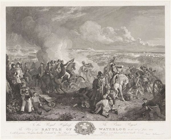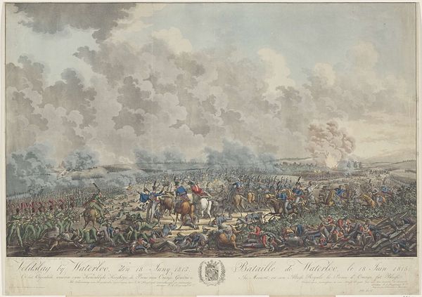 This print, "The Battle of Waterloo, 1815", offers a bird's-eye view of the culmination of the Napoleonic Wars. Its anonymous creator worked with engraving, etching, and possibly aquatint, all labor-intensive intaglio processes involving the meticulous carving of an image into a metal plate. The fineness of the lines and the subtle tonal gradations suggest a highly skilled hand, capable of translating the chaos of battle into a relatively ordered composition, fit for mass production and distribution. Prints like these played a crucial role in shaping public opinion and national identity in the 19th century. The very act of printing—multiplying the image—speaks to the industrialization of warfare and its representation. It is a stark reminder of the human cost of conflict, but also the industrial means of memorializing it. Looking at it this way helps us to understand the broader social, political, and economic forces at play during the period.