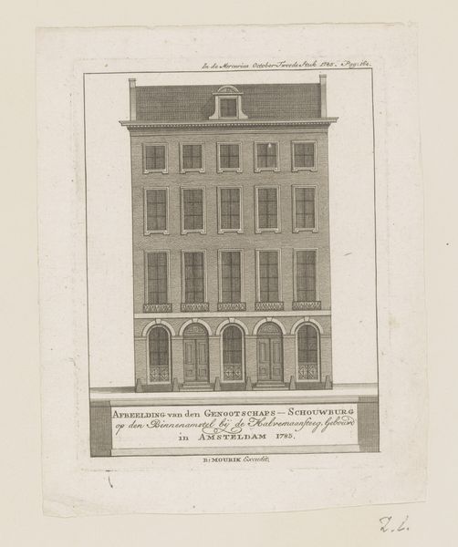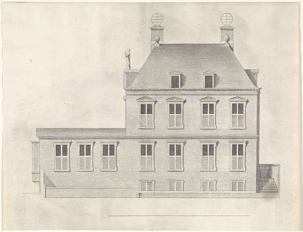 Editor: Here we have Bastiaen Stopendael's "Rear View of Gansenhoef House in Maarssen," a print from 1715, housed in the Rijksmuseum. It's a very formal depiction of a building, almost architectural in its precision. What do you see in this piece? Curator: It's fascinating how seemingly straightforward architectural renderings can hold such a wealth of cultural memory. Look at the symmetry, the balanced placement of windows and the stoic presence of the chimneys; this isn't just a house, it’s an embodiment of order, reflecting the values of the Baroque era. Editor: Order, definitely, but almost… austere? Is there more to it than just architectural design? Curator: Indeed. The lack of people, the emphasis on structure—it almost presents the house as a symbol of enduring power, perhaps even a little detached from the everyday lives within. Consider the cultural context: What might a building like this have represented to the Dutch elite of the 18th century? Editor: Maybe stability? In a time of political and social shifts, a grand house symbolized established wealth and legacy? Curator: Precisely. It's a visual assertion of status. And notice how the lines, even in their precision, still allow for a certain play of light and shadow, giving the house a sense of volume, of presence. The symbolic language of architecture, when captured by an artist, offers a fascinating window into the soul of an era. Editor: I hadn’t considered it as more than just a picture of a building. I see it now; there's a deeper layer to unlock in how it presents power and stability. Curator: Absolutely, it invites us to look beyond the surface. The cultural weight behind visual representation of what’s most meaningful to those who made and lived within this imagery can really shift your perceptions about art, and what has lasting value to audiences over time.