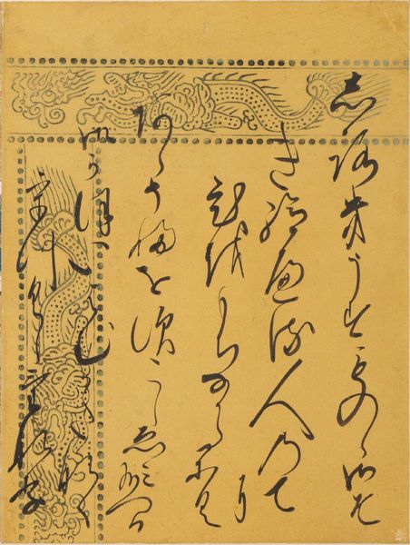 Editor: This calligraphic excerpt, "The Cicada Shell," from the Tale of Genji, is attributed to SanjÅnishi Sanetaka. The inky black characters dance on a warm, textured surface. How do you interpret the artist’s choice to capture this particular passage? Curator: It’s a fleeting moment suspended in time, isn't it? The "Cicada Shell" chapter speaks of illusions and ephemeral beauty. Sanetaka's brushwork seems to mimic that very transience. Notice how some strokes are bold, confident, while others fade, almost disappearing. Editor: I see what you mean! There's a sense of fragility, like the cicada shell itself. Curator: Exactly! The beauty lies not just in the legibility of the text, but in the emotional weight carried by the brush. It's a quiet meditation on impermanence. What do you take away? Editor: I guess that even something as simple as calligraphy can be a profound way of reflecting on life and death. Curator: Indeed. It shows us that sometimes the most profound beauty lies in the most subtle expressions.