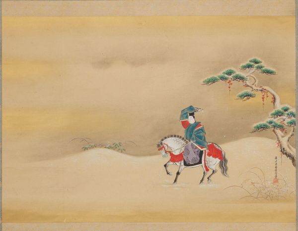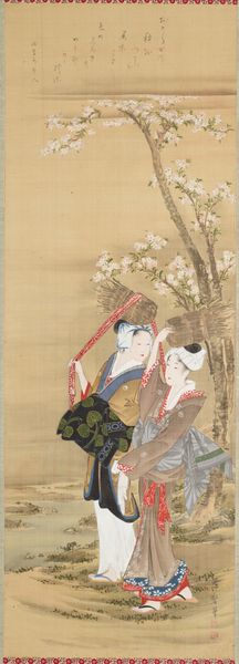 Editor: This is *Poetess Ise no Tayū*, a painting by Miyagawa Chōshun from around the 18th century. It looks like it’s made with watercolors. I’m struck by the delicate balance between the figure and the natural elements. How do you see the artist's choices relating to material and context influencing the meaning of the artwork? Curator: I see this not just as a pretty picture of a poet, but as a complex document of artistic labor and material consumption within the Edo period. The creation of this painting relied on specific materials – paper, pigments, brushes – each sourced and produced through different labor practices. Consider the watercolor: how did its availability shape artistic expression and skill development? Editor: That’s a fascinating way to look at it. So, it’s less about the idealized image of the poetess and more about the physical processes behind the work? Curator: Precisely. Ukiyo-e wasn't just about depicting "the floating world" – it involved block carvers, printers, and publishers, a whole commercial apparatus! The availability, and cost, of certain pigments likely influenced Chōshun's color choices and his painting practice. How does the physical reality of creating the piece reflect the social realities of 18th-century Japan? Think of it less like the individual genius of Chōshun, but instead how material conditions made the piece possible. Editor: That makes so much sense. So, the artist wasn’t just creating art, but engaging with a whole network of material production and consumption. Curator: Absolutely. Examining these connections breaks down that division between "high art" and everyday craft, because what IS the difference here, right? Now look at the materiality again. How can studying what survives – and doesn’t – allow us to understand the processes of artistic creation during this period? Editor: Looking at it now, the whole commercial aspect adds so many layers of complexity to what seems, at first glance, like just a beautiful painting. I hadn’t considered the social implications of each pigment used. Thank you! Curator: The beauty of materialist art history! Now go forth and question those precious labels!
