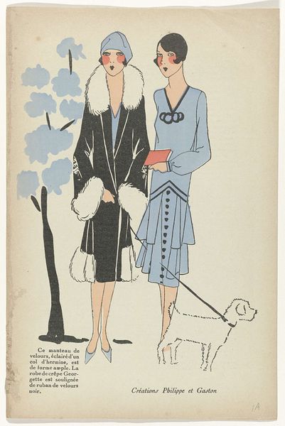 This is G-P. Joumard's "Très Parisien, 1925, No. 9: Supplément: Mots Croissés," a pochoir print that offers us a glimpse into the sartorial elegance of the jazz age. The composition, with its stylized figures and geometric patterns, immediately strikes a balance between representation and abstraction. The figures are rendered with clean lines and flat planes of color, typical of the era's fascination with modern design. Note how the checkerboard pattern of the suit on the left creates a visual rhythm that is both dynamic and ordered. This echoes the broader artistic concerns of the time, where artists sought to reconcile traditional forms with the burgeoning industrial age. The muted palette, punctuated by the occasional splash of pink, evokes a sense of restrained luxury. The print destabilizes conventional notions of portraiture by prioritizing style and form over individual likeness. The figures, almost interchangeable, serve as mannequins for the clothes, reflecting the rise of consumer culture and the commodification of identity. Joumard invites us to interpret the artwork as a commentary on the performative aspects of modern life.