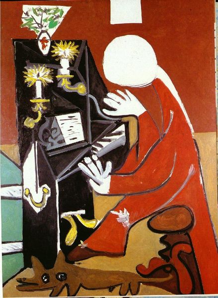 Editor: Here we have Picasso’s "Femme au Chien," created in 1962 using mixed media. There's a curious tenderness to it, even with the fractured forms. How do you interpret this work, especially considering its place in Picasso's oeuvre? Curator: It's important to remember that in the latter part of his career, Picasso often revisited themes and styles. “Femme au Chien” speaks to his interest in portraying domesticity, but within the context of his own evolving Cubist language. Dogs, especially, were common companions represented in art, acting often as symbols of fidelity or status. What do you make of this painting's fragmented nature? Editor: It makes me think about how identity is perceived, like we are a sum of fractured perceptions from others or even ourselves. Curator: Exactly. Considering the post-war art market, there was a huge demand for Picasso’s works and his art production increased enormously. A simplified visual language made his artwork very easily recognizable for buyers, yet still intellectually engaging, don’t you think? Editor: I see what you mean, his distinct style became a marketable image of his brand as an artist. Does that influence the reception and importance we give the artwork nowadays? Curator: Absolutely! Museums played a pivotal role in establishing and promoting particular narratives about art history. With this work, institutions continue to promote Picasso’s iconic style and sustain a specific art market. Considering this commercial appeal helps us better to understand why this work remains important for so many viewers even today. Editor: I never thought about art impacting museum representation or market so deeply before. This makes me think of the politics behind art and how public perception contributes to an artist's success. Curator: Exactly. When considering artworks, think about their social life. Artworks inhabit multiple spaces-- private collections, auction houses, museum vaults. This is one reason why it's crucial to have multiple approaches and viewpoints in understanding a masterpiece such as “Femme au Chien.”
