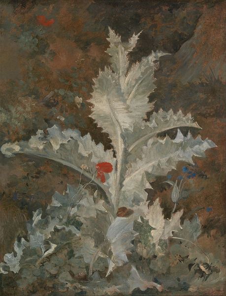 Curator: Roger Fry, a key figure in the Bloomsbury Group, painted this piece entitled "Still Life: Flowers." Editor: It feels quite muted, almost somber, doesn't it? Even with the floral subject matter, the dark palette subdues any expected vibrancy. Curator: Indeed, and that darkness speaks volumes. Fry was instrumental in introducing Post-Impressionism to Britain. This work, with its visible brushstrokes and flattened perspective, reflects that influence. He championed artists like Cézanne, believing in art for art's sake. Editor: Exactly! Look at how Fry uses the impasto technique, building up the paint in layers, especially in the petals. There's a tension between representation and abstraction that's quite compelling. Curator: Absolutely. Fry sought to elevate the aesthetic experience, freeing it from Victorian sentimentality. This piece challenges the traditional role of floral paintings as mere decoration. Editor: A successful challenge, I think. The restrained palette and bold strokes create a complex and thought-provoking still life. Curator: It offers a glimpse into the intellectual circles that shaped early 20th-century British art. Editor: A fascinating demonstration of form and color, a perfect example of Fry's avant-garde approach.
