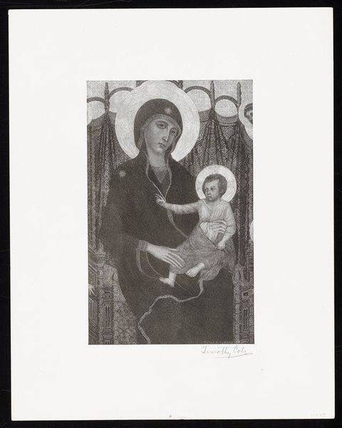 Curator: This is Eric Gill’s “Madonna and Child”, a wood engraving held in the Tate collections. Editor: It’s striking, the stark contrast between the black ink and the off-white paper. The simplification of form is quite powerful. Curator: Gill, deeply involved in the Arts and Crafts movement, explored the relationship between art, labor, and religious belief. He challenged the hierarchy that privileged painting and sculpture over printmaking. Editor: Yes, and this print speaks to that. It's readily reproducible, accessible. How does that democratizing impulse play into the socio-religious context of the time? Curator: The image circulated widely, reproduced in journals and books. Gill was interested in bringing sacred imagery into everyday life, not just keeping it in churches or museums. Editor: The flat planes, the reductive approach… I wonder about the woodblock itself. What kind of tools did he use? How did the grain influence the final image? Curator: Thinking about its function and material invites us to reflect on the many hands and processes involved. Editor: Absolutely. It really underscores how Gill blurred those boundaries, prompting us to reconsider what we value as 'art'.