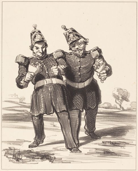 Editor: This is "Drie Britse militairen," or "Three British Soldiers," a coloured pencil drawing by Richard Simkin, probably from the late 19th century. They look so formal, yet the soldier on the left seems to be running. It's an interesting contrast. What stands out to you about this piece? Curator: The image immediately evokes the powerful symbolism of the British Empire. The formal portraiture locks in their perceived sense of order and control, but consider how the artist chooses to depict movement. One soldier advances, perhaps charging forward, the sound of the bugle implies an upcoming event. Why does Simkin portray the three figures against the backdrop of many faceless figures marching steadily into an unknown background? Editor: So, these three are distinct, and those other figures in the back are more like part of a mass? Curator: Precisely. Are they heroes? Are they victims? Look closely at their uniforms, the arrangement of buttons, the colour of the trim, the gleam of their metal. These uniforms signal hierarchy and function. They're ciphers of Imperial power, perhaps. The uniforms give meaning to who these men are in service. What would happen if we stripped away their uniforms? What might their stories reveal then? Editor: I never thought of uniforms as symbols that way, as almost like… masks of identity. That’s so interesting. Curator: Think about it: in many cultures, specific clothes are required or carry special symbolism. A crown indicates a king or queen. The arrangement, cut and design is meaningful, beyond just decoration. This colored pencil drawing, seemingly simple, opens up layers of consideration regarding individual identity and state power. It is more than just a portrait, isn’t it? Editor: Definitely. Now I see that the individual is presented only through the symbolism of their clothing and their role in this... procession, maybe? I will look at uniforms differently. Thanks!