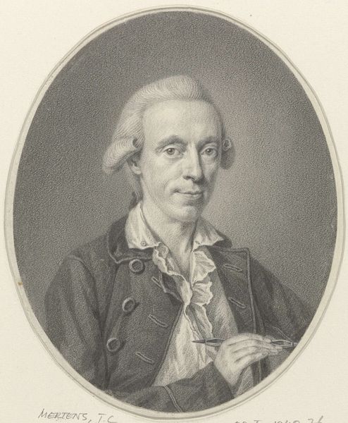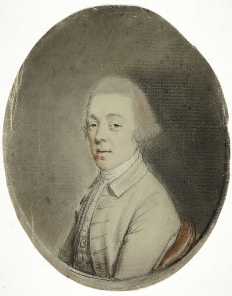 Curator: Here, we have a piece from the eighteenth century, "Portræt af Christian VII" by Jens Juel, rendered in oil on canvas. Editor: Oh my, he looks like he's seen a ghost! Very pale, intense gaze. There’s something melancholic, maybe even a touch… manic, in the eyes. Curator: The composition directs our gaze squarely to his face, framed as it is by the oval format. The tonal contrast, particularly between his pallid complexion and the dark background, serves to intensify the effect. Notice how the artist masterfully employs the chiaroscuro technique. Editor: True. The sharp contrast isolates him and his…interesting hairdo. The light almost bounces off that wig, creating a halo effect, despite his troubled expression. There's a lot of detailed embellishments on his clothing—some might find that interesting, but I'm stuck staring into his eyes. Is it just me, or is there a hint of a smirk hiding in there? Like he knows something we don’t? Curator: One must also consider the semiotics of portraiture during this period. A king’s portrait wasn't just a likeness, it was a carefully constructed message of power and authority, regardless of the actual individual's qualities. His posture is erect and dignified, though somewhat rigid. The sash and decorations are indicative of royal status. But if we see instability and internal division reflected in his features, could that undercut the official rhetoric? Editor: Perhaps the artist captured something more nuanced than just kingly power? This fellow certainly seems more interesting, complex, troubled. He doesn't radiate stability at all. The painting teases—a powerful image of weakness perhaps? Or hidden intelligence beneath a fragile exterior. Now, that would be far more interesting. Curator: An intriguing reading, considering Christian VII’s documented struggles. Such portraits serve as potent sites of analysis, no? Thank you, as ever, for sharing such wonderfully immediate reflections. Editor: Absolutely! I'm always happy to dive deep! This one is bound to keep me thinking for quite a while...