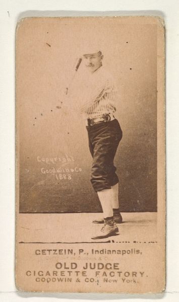 Curator: Here we have a curious albumen print dating back to 1889, "Mortimer Martin 'Mart' McQuaid, Right Field, Denver," as part of the Old Judge series created for Old Judge Cigarettes. The image, originating with Goodwin & Company, captures a baseball player mid-action. Editor: My immediate sense is one of melancholy, tinged with anticipation. It's more than a portrait; it feels like a fleeting moment captured, laden with a history both personal and collective, given the context of advertisement of addictive substances. Curator: It’s interesting you mention collective memory, because these cards did more than advertise cigarettes. They subtly, or perhaps not so subtly, embedded the burgeoning sport of baseball, and its heroes, into the national consciousness. McQuaid here becomes a symbol, of athleticism, Americana, and perhaps, the aspirational identity peddled to the smoking public. What kind of signs and symbolic elements are particularly striking to you? Editor: The most arresting, symbolically, is the baseball seemingly suspended in mid-air. McQuaid's outstretched hands evoke a sense of expectation and uncertainty, almost mirroring how capitalist enterprise also suspends workers and consumers in that same manner. Further, I find that sepia tone both authentic and subtly distorting, lending a romantic aura to what was, at the time, simply product marketing. This photo, therefore, works not just in capturing this player, but as part of a complex web of representation and capitalism. Curator: Yes, the albumen print medium lends itself to a softening effect, almost like a mythologized glimpse into the past. Beyond its function as an advertisement, I'm drawn to the careful construction of McQuaid's image: his pose, clothing, even the light itself seems to serve in portraying something specific. It speaks to a careful construction of American masculinity. Editor: The fact that such seemingly "innocent" cards were circulated with cigarettes raises complex ethical considerations too. Was it meant to cultivate an illusion of wholesomeness, maybe attempting to cloak harmful activities behind imagery linked with positive things, such as leisure, sports and togetherness? As such, viewing these works allows me a point of view of 19th-century advertising and its means to engage viewers. Curator: Looking at this photograph has changed how I think about advertising. Thanks for your insight. Editor: And thank you, seeing this ad in that manner opens avenues for reflection that exceed a traditional art review.