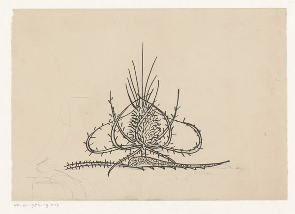 Curator: Charles Arthur Wells Jr. crafted this etching, probably in 1962, titled "Murex tenuispina". Editor: Striking. The texture and those dramatic spines create a captivating sense of something both fragile and dangerous. The almost monochromatic palette contributes to its intensity, doesn’t it? Curator: The monochromatic choice and etching process serve to amplify the material reality of the shell. Each line, each shadow, speaks to the artist's hand and the acid's bite on the plate. Think of the laborious process needed to produce a single print. Editor: Exactly. Speaking of process, look at how the converging lines and controlled gradation articulate its three-dimensional form, which enhances its presence against the flat, subdued background. The stark contrast helps too. Curator: The shell itself, though—consider what that represents. In Wells' context, perhaps this shell serves as a specimen, reflective of the way marine life and their bodies are regarded as materials in research. His choice of printmaking – a medium readily reproduced - creates interesting issues of value and accessibility in artistic and scientific endeavors. Editor: Interesting. I see it too as a powerful symbol. A symbol for both protection and vulnerability, the shell evokes the fragility of life. Curator: Absolutely, and etching perfectly captures that dichotomy. The delicate lines contrasted against the rougher, textured background emphasizes the shell’s own delicate but resilient architecture. Editor: Wells captures such tactile sensation of it— the spines practically beg to be touched, and one cannot but marvel at the interplay between smooth and ridged surfaces, hard and soft outlines. Curator: An act that links art with material and scientific cultures, and considers their overlapping values. It really encourages us to re-examine what is often dismissed as 'craft.' Editor: It invites us to ponder these structures, to explore not only the inherent forms, but also how light plays and dances with the natural world to create stunning visual echoes. Curator: This etching becomes more than just a portrait. The work prompts us to see beyond surface aesthetics and connect with the labor, production, and material embedded within the print itself. Editor: True. Thank you, this exploration was truly fascinating. I will always appreciate it in its own aesthetic terms from now on.