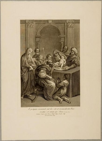 Curator: Here we have "Nativity" by Louis François Mariage, held at the Harvard Art Museums. Editor: It’s a rather stark composition, isn’t it? The sharp contrasts create a dramatic mood, almost theatrical. Curator: Indeed. Note the artist's skillful use of line to define form and texture, particularly in the drapery and the figures' musculature. The materiality of the printmaking process itself adds a layer of depth. Editor: But also, the social context is striking. The artist is reinterpreting the traditional nativity scene with the labor shown in the shepherds, and the careful depiction of the stable interior. Curator: An astute observation. The composition's balance, however, serves to elevate a sacred narrative by organizing it around a central, divine event: the birth, rendered using a pyramidal symmetry with the holy family. Editor: I see a fascinating blend of craft and devotion, revealing the human labor in portraying the divine. Curator: A powerful demonstration of how the artist's design can shape spiritual experience. Editor: Leaving us to reflect on the means and meaning behind such iconic imagery.