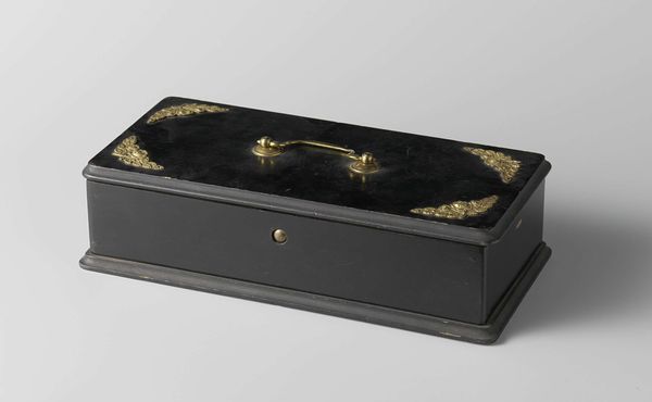 Editor: This object is a writing box or ‘schrijfcassette’ that includes a depiction of ships at the bay of Batavia. Created between 1800 and 1825 with mixed media and wood. There's a subtle sadness about this piece; maybe it's the miniature scene of ships against a dark background that evokes a sense of loneliness and colonial enterprise. What do you make of this work? Curator: It speaks to me of journeys, of longing and remembering a faraway home while establishing a life in a new place. It’s almost like a portable daydream. Think about it, the artist carefully placed a miniature landscape on an everyday object. This simple black box then became a vessel of imagination. Who used it? What letters were written at this traveling desk? Love letters? Tales of loneliness? Editor: It's fascinating to consider that an everyday object could be so deeply imbued with meaning. Given the colonial context, what’s your take on the ‘Orientalism’ style classification applied here? Is that fitting? Curator: That's a great question! Yes, the hint of “Orientalism” highlights a Western fascination, maybe even romanticization, of the East. In that way, yes, it fits, but to see this box purely through the lens of colonial gaze feels like a limited perspective, don't you think? Perhaps the tiny floral flourishes and elegant ship compositions also suggest the work of an Indonesian craftsman catering to European tastes… I wonder if it's a souvenir from afar for a merchant shipping tea and spices back to Europe. What do you think about the cultural context of production? Editor: Good point! It makes you consider it less as a simple object and more as a historical and cultural crossroads. I definitely look at this piece with fresh eyes. Thank you! Curator: Indeed, It's like looking at a tiny time capsule with a spyglass.