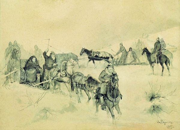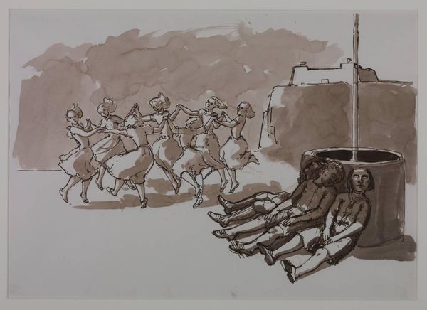Curator: This is Picasso’s 'Bullfight Scene,' currently residing here at the Tate. The piece appears to be swiftly rendered, perhaps an ink wash. Editor: It feels primal. Raw energy distilled into blacks and whites. You can almost hear the roar of the crowd and the snorting of the bull. Curator: Consider that the bullfight served as a recurring motif in Picasso's oeuvre, often interpreted as a symbolic representation of the struggle between life and death, or even a stand-in for political turmoil in Spain. The process of its making--the rapid application, the monochrome palette--only amplifies the inherent drama. Editor: Indeed, the simplification lends it a universality. The absence of colour removes it from the specifics of any given event, making it an enduring symbol of conflict. It speaks to the politics of spectacle and violence inherent in the tradition of bullfighting. Curator: The paper itself takes on importance. Its texture, its absorbency, its role as the very foundation of the image’s existence. We must appreciate the dialogue between the artist's hand, the ink, and the material support. Editor: It's a stark reminder of the complex relationship between art, culture, and power. Fascinating.