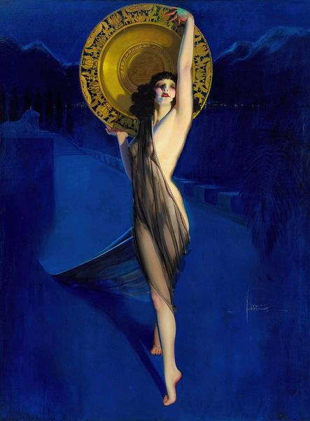 Curator: Here we have "Le Vin De Tokai," an oil painting attributed to Luis Ricardo Falero. Editor: Well, immediately, it strikes me as rather decadent. The glowing, amber light against the dark backdrop... the whole thing is sensual and heady. Curator: It's quite characteristic of the erotic undertones found in much of Falero's work, aligning with trends within Academic art, especially his portraits exploring the female form. The composition clearly emphasizes her as a modern Venus figure, posed on and in relation to this oversized decanter, which dictates the subject matter. The wine seems to emanate from the decanter like some elixir. Editor: I am really interested in the glasses depicted on the table. What are those intricate carvings on them? Is the material actually glass or maybe a gilded metalwork imitating it? The production of objects of refinement, what does the presence of these costly items tell us about social contexts in which something like this appears? Curator: Exactly. It invites questions about how the viewer interprets its meaning. The woman, poised in what appears to be, in our contemporary setting, an awkward arrangement of flesh upon metal, can also been read through orientalist visual rhetoric—a continuity of objectifying representations of the ‘exotic other,’ often feminine. And there may even be specific Eastern European and/or Magyar traditions at play, hinted at in the Tokai wine mention. Editor: It speaks volumes about the tastes and desires cultivated during its time and the materials employed to embody them. You can almost trace the steps in creating that shine, reflecting a particular attitude towards craft and luxury. Curator: Falero taps into a set of historical archetypes to convey his imagery, mixing a little classical allusion with a dose of the "forbidden", drawing on historical precedent and cultural anxieties to do so. That sense of familiarity—altered just enough by a modern touch—allows for immediate entry to the painting’s overall affect. Editor: Seeing how it's laid down—the brushstrokes building volume, playing with light—grounds the painting within a tactile reality even amidst its ethereal imagery. That dialogue between material presence and evocative imagery interests me deeply. Curator: Absolutely, examining the ways symbolism intertwines with the physical manifestation is the crux of interpretation, isn't it? Editor: Indeed. Looking deeper beyond mere representation reminds us to acknowledge production that results in this aesthetic.