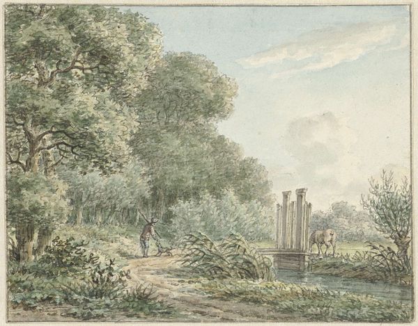 This is Cecilia Barbiers' watercolor titled ‘Landscape with Resting Wanderer’. The artwork invites us into a tranquil scene, dominated by a muted palette where greens, browns, and greys blend softly, evoking a sense of calm and introspection. The composition is structured by the placement of trees that frame a small structure in the background, drawing the eye towards the center. The application of watercolor, thin and translucent, allows the underlying paper to contribute to the overall effect, creating an airy, dreamlike quality. This technique reflects a broader artistic interest in capturing transient atmospheric conditions and the subjective experience of nature. Barbiers plays with the semiotics of landscape painting, contrasting the grounded figure of the wanderer with the ethereal, almost dissolving forms of the natural elements. This tension between presence and absence invites us to ponder our place within the natural world and our fleeting existence.