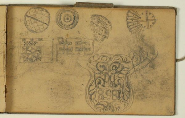 Curator: Take a moment to consider "Ornamentstudier," or "Ornament Studies," created between 1900 and 1904 by Niels Larsen Stevns. It’s currently held at the SMK, the National Gallery of Denmark. It seems to be primarily pencil and colored pencil on paper. Editor: It feels almost like peeking into the artist’s private sketchbook. There’s an intimate, exploratory quality in these fragmented forms. Some are quite whimsical, almost playful. Curator: That intimacy speaks to the sketchbook tradition, where artists work through ideas. We can see how Art Nouveau floral motifs intersect with medieval-inspired symbols – notice the almost heraldic arrangement of elements, the wing motifs… there's a clear conversation with historical visual language. Editor: Yes, I'm struck by the variety. The angular geometric patterns alongside the organic, flowing curves. Are these preparatory sketches for a larger project, do you think? A commentary on ornament styles in general, or just experimenting with how to rework iconic visual imagery of the past? Curator: Precisely, understanding Stevns' context sheds light. Around 1900, there was a rediscovery and reinterpretation of historical artistic styles, a reflection of Danish cultural identity amidst broader European artistic movements. Stevns engages in this rediscovery, evident in his incorporation of Christian iconography and medieval design principles. The museum would have collected artifacts, photographs, publications that provided these ideas about an idealized past. Editor: So it’s not merely decorative; these drawings reflect the revival of interest in earlier symbols? The artist takes up these antiquated art languages, but how is this nostalgia reframed? It feels quite modern in its combination of all these styles, or at least progressive-minded at that moment. Curator: Stevns employs what we would now describe as 'pastiche', and that has resonance in contemporary culture today as people collage symbols of identity that reflect our individual and group personas. The heart, for example. It seems to have roots as the 'heart of Jesus' but takes on new secular symbolism today... This simple study opens to much deeper meanings for the contemporary viewer! Editor: I agree! “Ornamentstudier" invites a certain open ended conversation around continuity and our relationship to what comes before. Very well stated, it seems to me!