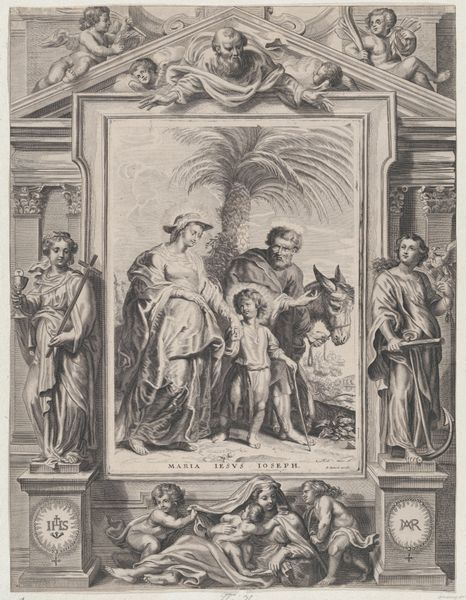 Conrad Lauwers created this engraving, "The Four Evangelists," around the mid-17th century, presenting a masterclass in the use of line and texture. The composition is framed by robust columns and decorative elements above, drawing our eyes into the scene. Note how each evangelist is distinctly rendered through variations in shading and posture. The engraving technique allows for a remarkable range of tonal values, creating depth and volume. Look closely at how Lauwers uses hatching and cross-hatching to build form. The texture of the drapery, the musculature of the animals, and the ethereal quality of the angels are all conveyed through these precise marks. The animals aren't merely decorative but are symbols attributed to each evangelist—Matthew, Mark, Luke, and John. What does this imagery mean? How does it challenge fixed meanings? Lauwers invites us to decode this visual theology through carefully constructed signs. The beauty of art lies in its ability to engage with and reflect cultural discourses.