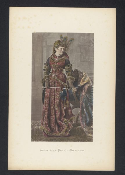 This is an undated, unsigned portrait of Countess Franziska von Trauttmansdorff-Weinsberg, created using a printing technique that simulates the appearance of a hand-painted artwork. The composition is dominated by the figure of the Countess, whose opulent dress in shades of deep burgundy and gold creates a strong visual focus. The artist's emphasis on texture, particularly in the rendering of the Countess's gown and elaborate lace hat, is remarkable. Note how the fabric appears to shimmer with a tactile quality that invites a close reading of its materiality. The background, a muted gray, serves as a neutral space, pushing the Countess forward and drawing our attention to the formal arrangement of lines, shapes, and colors. It is as if the artist sought to capture not just a likeness, but a study in form and texture. The artist’s strategic use of visual elements underscores how even in portraiture, the formal qualities of an artwork are crucial to its communicative power. It challenges our understanding of portraiture by destabilizing fixed meanings and prompting ongoing interpretation.