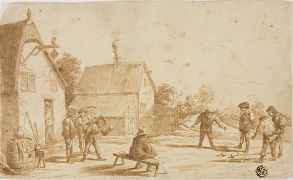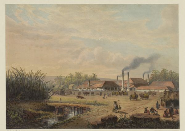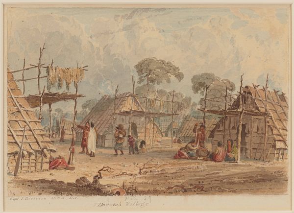 Editor: This is Charles Rochussen’s "The Blacksmith," created in 1876. It appears to be a watercolor painting. There's a real sense of quiet industry here, everything bathed in a hazy light. What do you see in this piece? Curator: Immediately, I see a portrait of industry and community. The blacksmith, the heart of this image, represents a linchpin of society. The figures gathered – the children, the woman at the door – speak to the blacksmith’s role within the village, more than just a tradesman. He’s central to the cultural and economic vitality of the village. Editor: So, you're saying it's more than just a snapshot of a profession? Curator: Exactly! Consider the symbolism of the forge itself – fire representing transformation and creation. The dark interior is suggestive of alchemy, the mysterious process of shaping raw material into something useful. And the smoke rising may symbolize aspirations, upward mobility and progress, a burgeoning industrial revolution. Even the colors used point to a very deliberate message, rooted in earthiness and dependability. Editor: It’s interesting to think about the connection to a broader cultural narrative like that, and to look beyond what my initial assessment suggested. Curator: The power of art resides in its symbols, in how they speak across generations. Looking at this image, consider the long, and continuing presence of these industries in the visual lexicon. Editor: I’ll definitely view genre paintings differently from now on. Curator: Indeed! Now, what other overlooked narratives might await our attention?