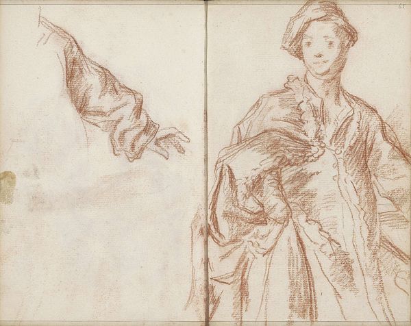Petrus Johannes van Reysschoot created this red chalk drawing, titled "Portrait of a Young Man with Hand on Hip," in the 18th-century Netherlands. The work's unfinished quality gives us insight into the artistic process of the time. Red chalk was a popular medium for preparatory sketches and studies because it was easy to work with and allowed for corrections. The drawing captures the sitter's pose and fashionable attire, but it also reveals the conventions of portraiture in the 1700s, where posture and dress communicated social status. Note how the young man’s confident stance reflects the ideals of masculinity and power prevalent in that era. To understand the drawing more fully, scholars consult period fashion plates, social histories, and artist’s manuals. Art is never created in a vacuum, and its meaning emerges from the complex interplay of social, cultural, and institutional forces.
