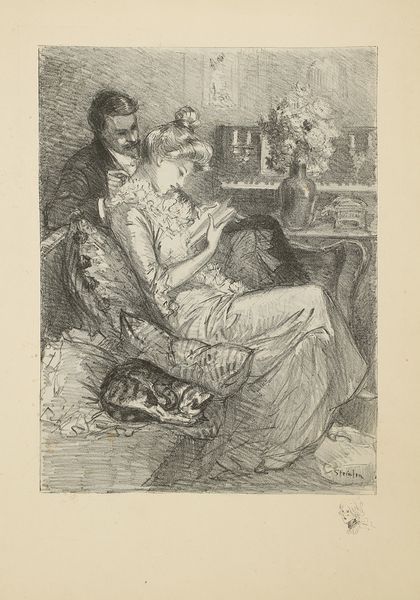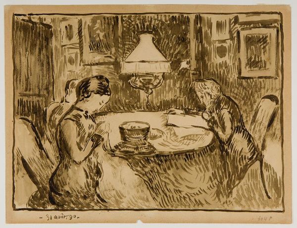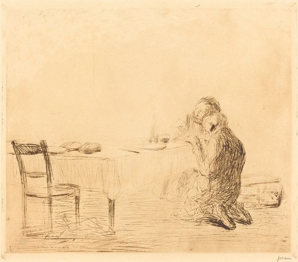 Jean-Louis Forain created this print, “The Private Room,” with lithography. The arrangement of figures and objects around the central table dominates the composition. A tension between intimacy and alienation is created through the varied poses and interactions of the three figures, offset by the stark formality of the table. The lithographic technique emphasizes texture through a dense network of lines and hatching. The artist achieves atmospheric depth and emotional intensity by limiting the tonal range. The stark lighting casts long shadows which not only define the forms, but also add to the scene’s somber mood. Forain's composition can be understood in the context of late 19th-century debates about modernity, class, and representation. The scene captures the sense of unease and moral ambiguity prevalent in modern urban life through its use of understated yet evocative graphic means.