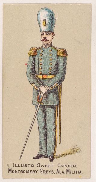Editor: Here we have "Saxon Uhlan, Germany, 1880," a print created around 1888 by the Kinney Brothers Tobacco Company. The detail on such a small image is pretty striking. It's almost cartoonish in its precise rendering, yet evokes this air of authority. What leaps out at you when you see this, honestly? Curator: Well, for starters, the juxtaposition of 'military might' and 'cigarette promotion' is quite the thought experiment, isn't it? Makes you wonder what kind of subliminal messages they were trying to puff out. I see a carefully constructed image, undeniably handsome in its old-world way. The fellow, with his meticulous uniform, stands so proper. But look closer. Is that confidence in his eyes or… a subtle flicker of self-doubt? It's all rather performative, wouldn't you say? Editor: Performative in what way? Curator: Think of the uniform as costume, a statement, and not necessarily reflective of inner character. The very idea of romanticizing soldiers was en vogue in those years... Does the commercial nature diminish it? Or does it offer another layer, questioning our very understanding of heroism? Editor: That's a great point. It’s like they are selling you an image of strength tied with their cigarettes! I hadn't considered it that way. So much more to it than first meets the eye. Curator: Exactly! Advertising often sells more than the product itself, a story, an aspiration… Makes you wonder what future archaeologists will make of *our* ads!