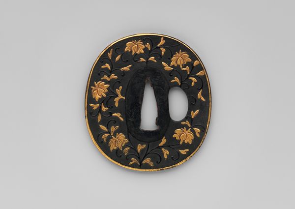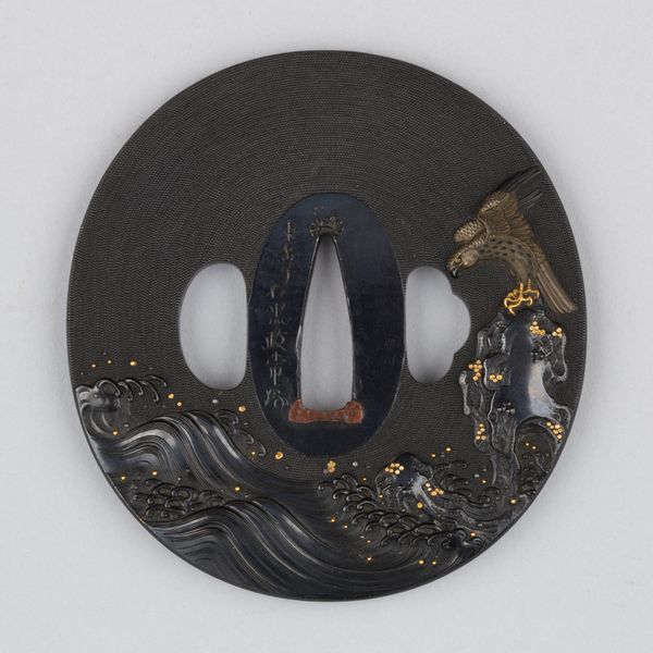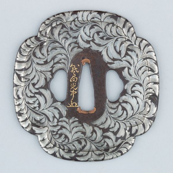 This is a hand guard by Munemasa Shinoda, it is a small circular iron plate, intricately decorated with metalwork. The dominant feature is a silver snake, its body coiling around the plate's edge, its head raised menacingly above one of the two rectangular openings. These negative spaces, framed in gold, disrupt the plate's surface, while a third aperture in the centre adds to the composition's complexity. The snake motif, in its detailed rendering, introduces a dynamic tension against the plate's static form. Shinoda’s choice of the serpent resonates with its symbolic meanings across cultures. The snake serves as a potent symbol of danger but is also a symbol of transformation and healing. The contrast between the dark iron and the shimmering silver of the snake creates a visual dichotomy that underscores this tension, challenging us to consider the interplay between protection and menace, tradition and innovation. This interplay invites ongoing interpretation.