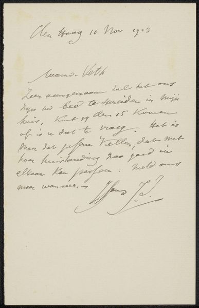 Editor: Here we have "Brief aan Jan Veth," a letter by Jozef Israëls, likely from 1888. It's an ink drawing on paper. What strikes me most is the intimacy of it; it feels like catching a glimpse of the artist's private world. How do you interpret such a personal piece? Curator: Intimacy is spot on! For me, it is like eavesdropping on a conversation from over a century ago. Just imagine Israëls, pen in hand, crafting not just words but an artwork with every flourish and stroke. The handwritten aspect provides direct connection with the creator. Notice how the letter *itself* becomes a portrait of his character? What do you notice about the composition? Editor: It's interesting, because the slant of the writing almost pulls you downwards. My eye travels to the bottom half first, and then back up to the address at the top. Curator: Exactly! Perhaps it suggests the weight of his thoughts, literally pulling the composition down, earthbound, but hopeful because, remember, it is a reply that mentions something along the lines of, "I shall do my best!" Doesn’t that fill you with this beautiful sense of quiet dedication? Also, I can't help but think of what isn't here... Jan Veth's reply... the other half of the story! Editor: That’s a great point. You've made me think about how art extends beyond the visible. Thanks! Curator: My pleasure. It’s lovely to remember that art is rarely an isolated expression. Now I am looking forward to reading more of Israëls work!