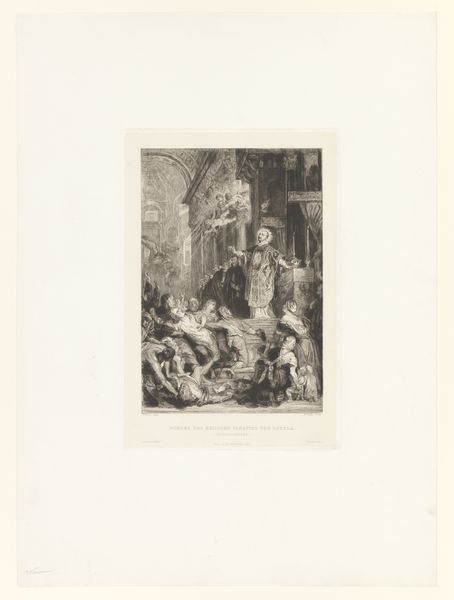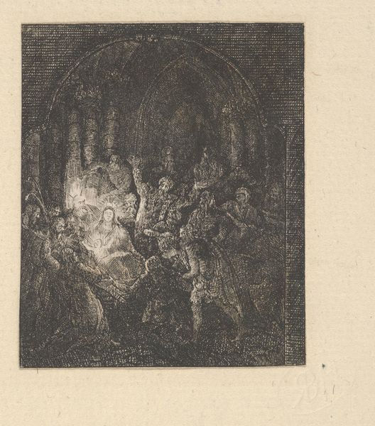 Editor: Richard Byron's "The Death of the Virgin," created in 1777, employs intaglio and etching in print form. It’s remarkably detailed, even for such a small piece, creating a very intimate atmosphere surrounding the Virgin’s deathbed. What grabs you when you look at this, what story do you think Byron is trying to tell? Curator: It feels almost as if we're intruding on a profoundly private moment, doesn't it? The busyness of the etching, the baroque flair... but it all collapses into this small space, focused on her bed. Perhaps the most interesting aspect is what’s *not* depicted; instead of the assumed triumphant assumption, we see something quite ordinary. The grief of humanity encircles her; the details pull the imagined scene out of the realm of myth and push it into, maybe, a small room like the one we are standing in right now? What feelings come up for you? Editor: I feel a sense of both sadness and serenity, seeing the expressions of sorrow on the faces, but also the quiet acceptance of the inevitable. Do you think the medium, the etching, impacts how we view the scene? Curator: Hugely! Etching, particularly with such fine lines, lends itself to introspection. It's not bombastic like some history paintings could be. The delicacy and detail invite a slower, more considered viewing, like holding your breath to enter that final moment with everyone else in the room. It removes it from the grandiose of oil and marble. Byron's work really makes me consider mortality and mourning as a shared human experience; there is something beautifully leveling about his art. Editor: I never thought about it that way, but you are so right; there is something incredibly humbling and intimate in his rendering. I think I'm seeing it differently now. Thanks! Curator: Anytime! The best art continues teaching us across a lifetime, after all!