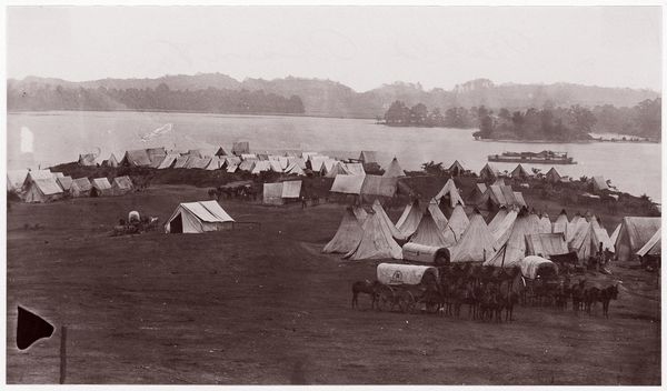 Andrew Joseph Russell made this albumen silver print titled "Military Railroad Camp, City Point, Virginia", but we aren't sure exactly when. This photograph captures the Union Army's main supply depot during the Civil War, a crucial logistical hub. Notice how the image juxtaposes the regimented rows of tents with the casual postures of the soldiers. The presence of the railroad hints at the industrialization of warfare, a key factor in the Union victory. Taken in Virginia, a state deeply entrenched in the Confederacy, the photograph subtly asserts federal control and infrastructure. Russell's choice to document this scene is significant. Was it an assignment from the military? Or did it reflect a personal desire to chronicle this pivotal moment in American history? These are the questions a social historian might ask. By examining military archives, period newspapers, and Russell's biography, we can unlock deeper meanings embedded in this seemingly straightforward image.