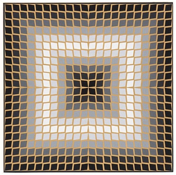 Victor Vasarely’s ‘Pulsar – Va’ is a real head-scratcher, playing tricks with your eyes and mind. Vasarely lays down these grey and black diamond shapes, neatly stacked in rows and then outlined in gold. The way the diamonds subtly shift in tone gives the illusion of a bulge, as if the whole grid is pushing outwards. It's almost like he’s playing with perception, using these simple geometric shapes to create a sense of depth and movement. Look closely, and you can see the precision in his work. Each diamond is carefully rendered, and the gold outline adds another layer of complexity. I think Agnes Martin would have liked this piece, especially the way Vasarely makes the whole surface seem to breathe and shimmer, pulling you in and pushing you away at the same time. It's a piece that reminds you art doesn't always have to be about what you see, but how you see it.