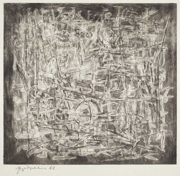 Curator: Oh, wow, this feels like stepping into someone's slightly anxious, yet utterly fascinating, dreamscape. Editor: We’re looking at Lawrence Kupferman's "Vertigo - New York," created in 1943. It’s an etching, part of his exploration of urban life. The artist’s skillful handling of the etching process is quite visible with such great linear variation and textures, isn't it? Curator: Definitely, it's this chaotic jumble that initially grabbed me! There's something very 'stream of consciousness' about how everything collides—skyscrapers wrestling with carousel horses and… is that supposed to be a political figure lurking there? It makes me think of the unsettling energy of urban life. The almost neurotic quality really vibrates off the paper, doesn’t it? Editor: Kupferman's work reflects the cultural context of his time. The limited edition print, made by hand, shows his personal connection to his art. There's labor in every mark, a resistance to the mass production beginning to consume everyday life. Note the density of the line work around areas he felt necessary for the viewers eye. Curator: True. It's funny how even a cityscape etching like this can reveal a certain emotional truth. It feels almost… pre-war anxiety. Maybe all that careful craft is precisely the antidote, or response to, the alienation of modern life, where labor feels increasingly meaningless. A quiet revolution in ink? Editor: I think you might be right. Considering the materiality, the directness of the engraving—it certainly adds a depth, even urgency, that’s hard to miss. You know that a print is something shared to larger communities, not just one person experiencing a singular painting. Curator: In any case, it’s impossible not to have some kind of visceral response. Looking at it more closely now, it almost makes me feel that kind of melancholic excitement only big cities can invoke—like when you are in the crowd, but simultaneously so incredibly alone. Editor: A fitting paradox reflected beautifully, and skillfully, through ink, paper and plate. A powerful visual document!