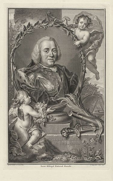 Jacob Houbraken created this portrait of Willem IV, Prince of Orange-Nassau, using engraving techniques. The composition is strikingly formal, structured around a central oval framing the prince. Note how Houbraken uses contrasting textures to differentiate surfaces, from the smoothness of Willem's face to the detailed fabrics of his attire. The print’s structure is layered with symbolic and allegorical elements. The lower segment displays a tableau of figures, possibly representing virtues or historical narratives associated with the House of Orange. Elements like armor, books, and foliage are arranged to flank the central portrait, creating a visual framework that adds depth to the image. Consider how the use of black and white emphasizes line and form, typical of engravings. These choices serve not merely to depict, but to construct meaning through the relationships between form and content, inviting ongoing interpretation.