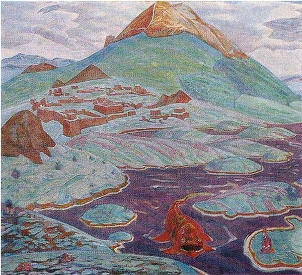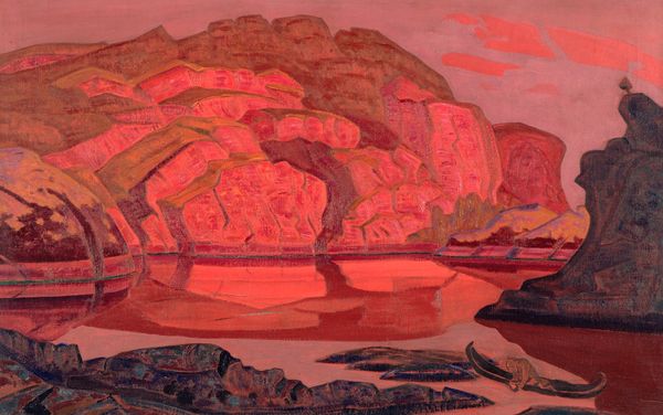Curator: Let's turn our attention to "Hidden Treasure," an oil on canvas completed by Nicholas Roerich in 1917. It’s currently held at the Nicholas Roerich Museum here in New York City. Editor: My first impression is a sense of vibrant, almost primordial, heat. The reddish-orange monochrome immediately draws the eye, creating a very strong mood despite the simplicity of the landscape. Curator: Indeed. Roerich's interest in post-impressionism and symbolism is evident here, moving beyond pure representation. Consider the structuring forms: the monolithic rocks dominating the scene are almost architectonic in their arrangement. The strong horizontal lines emphasize stability. Editor: And this consistent, dominant use of red speaks volumes. Red often signifies passion, courage, and in some cultures, even sacrifice. I can’t help but feel the scene resonates with ancient myths about hidden knowledge and treacherous quests. The boat at the water's edge certainly plays into that, doesn't it? A lone voyager on a journey. Curator: Perhaps, or it could also be simply an aesthetic counterpoint, the small, dark shape emphasizing the monumentality of the surrounding forms. Look at how the color itself is applied. See how the brushstrokes create textures that add to the overall drama without attempting photorealism. Editor: But isn’t the symbolism richer because of that very artifice? That this is a consciously *constructed* landscape suggests it holds some kind of symbolic truth. This feels less like a specific location and more like a projection of the artist’s inner world. Perhaps the "hidden treasure" is a metaphor for the inner work required for enlightenment. Curator: An interesting reading, and Roerich was certainly influenced by theosophical ideas, but the real achievement here may well be the manipulation of pictorial space. The way Roerich reduces forms to near abstraction… the almost geometric simplicity, and it creates a dreamlike intensity. Editor: Precisely! A dreamscape imbued with archetypal resonance. Roerich has managed to tap into something truly universal with this vibrant tableau of seeking. Curator: I concur, this careful formal arrangement truly emphasizes this unique vision of a hidden landscape. Editor: This exploration has given me much to consider; a painting that so deftly balances mood and symbol with masterful structure!