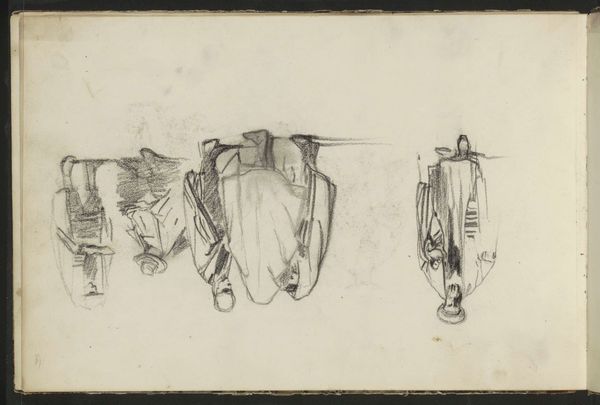Editor: This ink drawing, titled "Standing and Kneeling Men, Seen from the Back," was created by Willem Bastiaan Tholen between 1885 and 1931. It feels like a quick study of figures. What sort of story do you see in the gathering of these men? Curator: Immediately, I’m drawn to the gesture and postures. We're given the figures from the back, obscuring their faces. What do you suppose this denies or emphasizes? Think about depictions of the backs of figures throughout art history, from religious contexts to the modern era. Editor: It feels less individual, more like representing a collective experience, perhaps. A group or class of men? Curator: Precisely. It pulls focus to the group identity, hinting at themes of solidarity or communal labor, especially when viewed alongside other figural works. Does the lone, kneeling figure off to the side seem related, or distinct, in the context of the others? What might kneeling represent? Editor: I suppose they’re more isolated and possibly denote reverence, or even subservience depending on the setting. That really changes the feeling! I hadn’t considered the possibility of hierarchy or perhaps even suffering through this body language. Curator: Yes! And consider the impact ink on paper has versus, say, oil on canvas or sculpture. What does it suggest about the accessibility and democratic nature of the medium to document, analyze, or evoke empathy for everyday people and circumstances? Editor: So, the seemingly simple act of choosing ink really adds another layer of meaning. Curator: Exactly. Every mark carries symbolic weight and informs our understanding of collective cultural memory, social context and psychological underpinnings of these representations of men. Editor: It's amazing how much symbolism can be packed into what seemed like a straightforward sketch! Curator: Indeed. By considering cultural symbols, we reveal layers of interpretation.